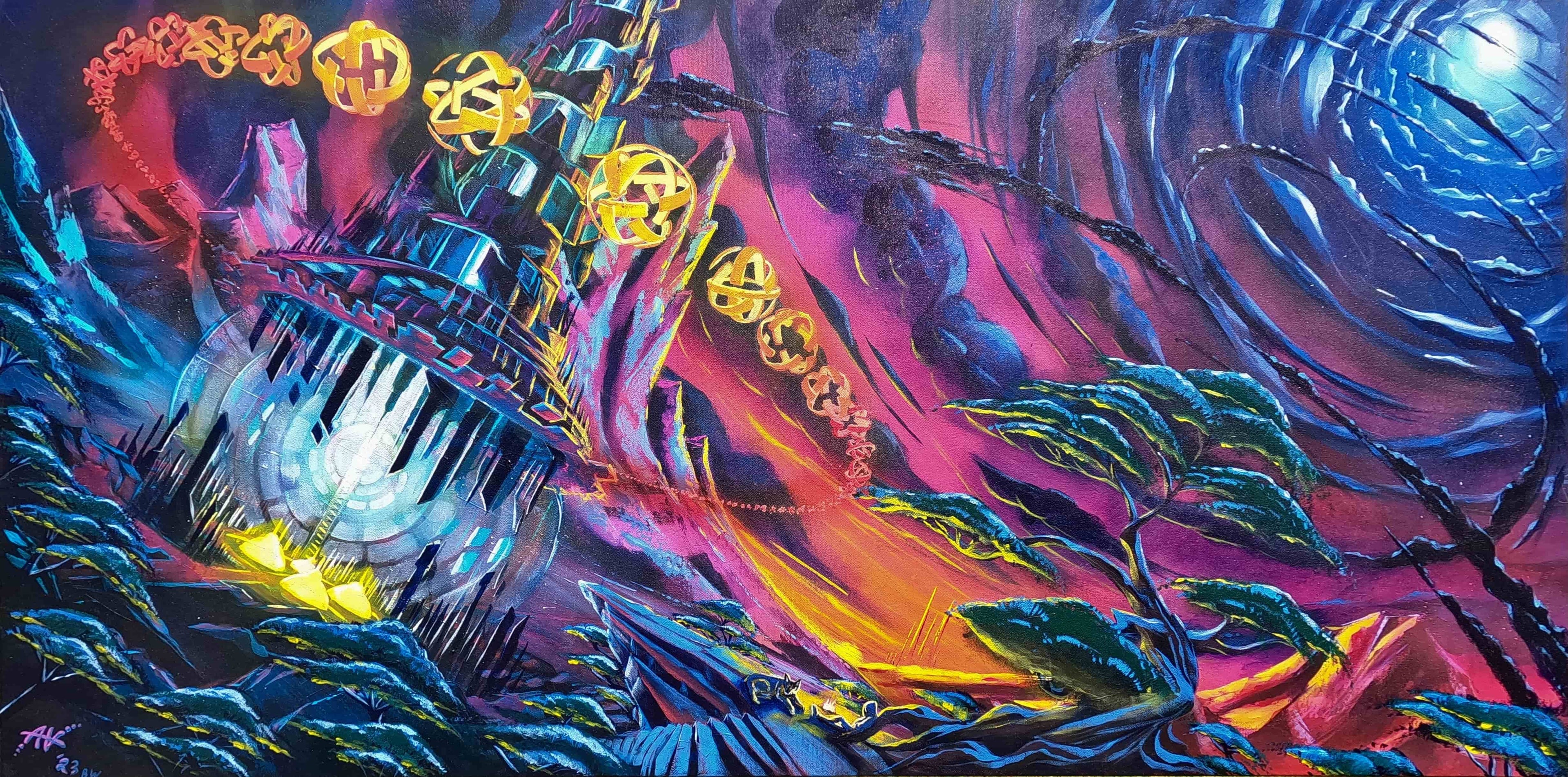 "The Source" is a monumental 7x5 foot masterpiece that secretly forms the outline of a human heart within its stunning technological landscape of hand-painted fractals and crystalline structures. This groundbreaking Plus Ultra style painting represents the ultimate fusion of mathematical precision and emotional storytelling.